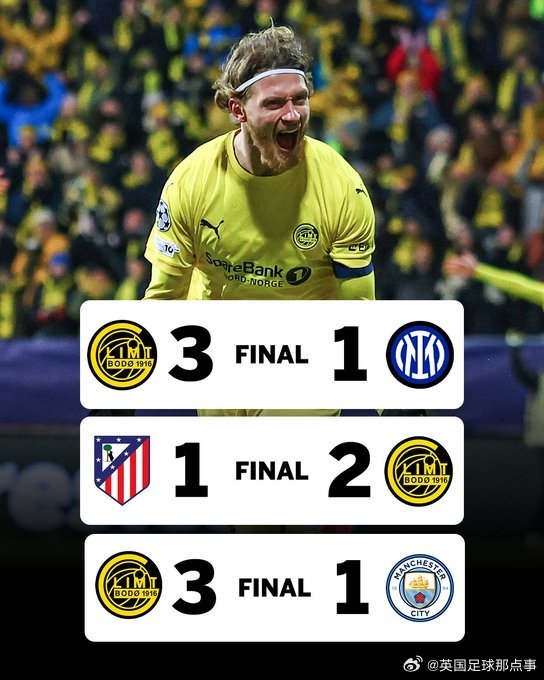 进入2026年后,博德只打了三场比赛。对手全是豪门,3-1国米、2-1马竞、3-1曼城,这样战绩莫说是小球会,哪怕是皇马来,也很难做到。然而,就是这样的从北极圈内走出的黄黑军团,正在用最不可思议的方式,书写着自己的足球故事。这是新的北欧奇迹也是欧冠扩军的成果,小人物,也有机会站上大舞台!“北欧神话”就此闪耀世界足坛。