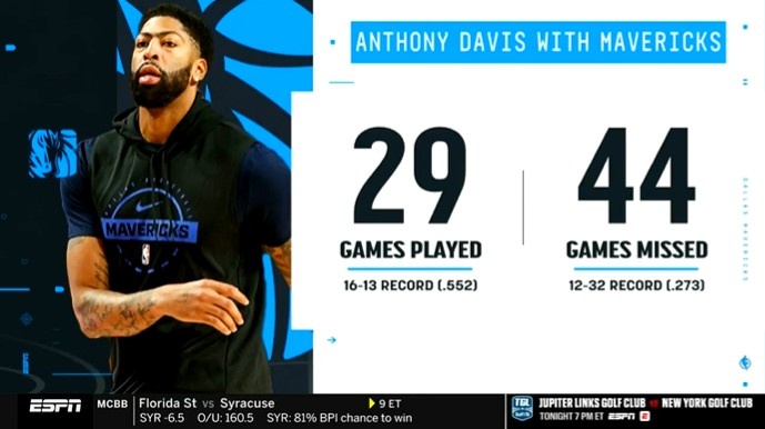 中超赛事直播-浓眉加盟独行侠后仅出战29场战绩16胜13负 缺席44场期间12胜32负